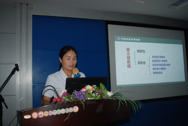 患者宣教是我院一直持续进行的一项为在院患者普及肾脏病知识的活动,7月13日下午,我院在学术报告厅内开展了全院患者宣教活动。本次患者宣教由四病区邢慧平医生授课,来自六个病区的住院患者及家属到现场听取讲座。邢慧平医生通过课件讲座形式为患者及家属们普及了肾病综合征的诊断思路,深入浅出,生动形象,让前来听取讲座的患者和家属获益良多。