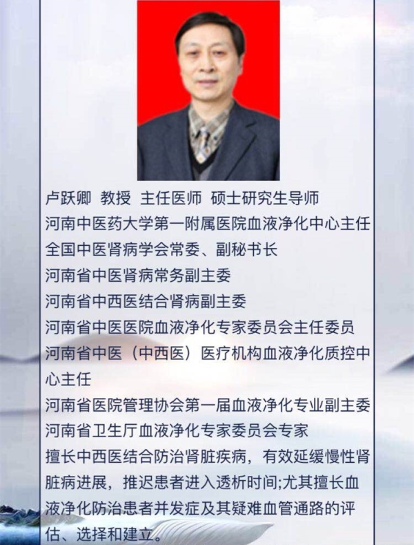 11:20-12:00 题目:《有关血液透析的十大问题》 主讲人:河南中医药大学一附属医院 卢跃卿