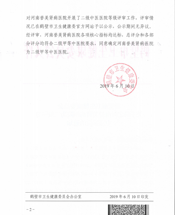 6月10日,鹤壁市卫生健康委员会下发了《关于确定河南誉美肾病医院为二级甲等中医医院的通知》(鹤卫中【2019】10号),再次确定河南誉美肾病医院为二级甲等中医医院。