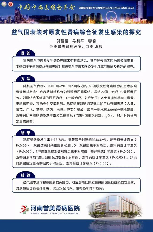河南誉美肾病医院王福群医生、贺蕾蕾医生出席,并在壁报交流区就医院入选论文《益气固表法对原发性肾病综合征发生感染的探究》与各地医生深入开展交流探讨。