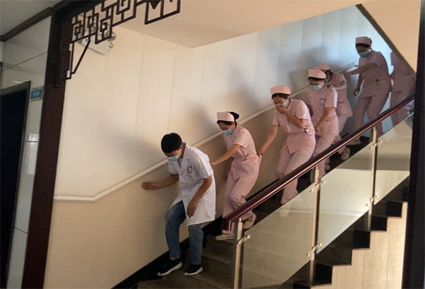 理论课上完,怎能少了实践。随后,我院医护人员进行了组织疏散逃离火灾现场的模拟演练。演练中,医生、护士等都积极参与,各个环节有条不紊,达到了快速、准确、成功的消防演练目的。
